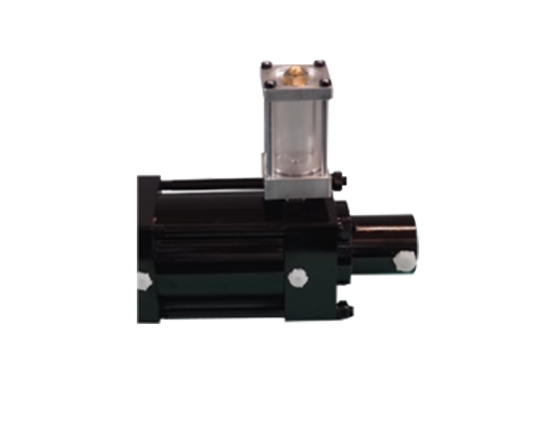 The Hydro-Pneumatic intensifier consists of a double acting Pneumatic Cylinder and a Hydraulic high pressure chamber. The Pneumatic Cylinder piston rod is forced into the hydraulic chamber resulting in high-pressure oil displacement.